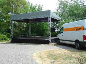 Das Bühnensystem mit Podium aus Bühnenpodesten à 2 x 1 m und solidem Bühnendach aus Aluminiumverstrebungen und Dachhaut aus widerstandsfähiger PVC-Plane (wahlweise grau-schwarz oder weiß-schwarz). Ideal für kleine Konzerte, Produktpräsentationen. Durch seine einzelnen Bühnenelemente ist der Transport des Bühnendaches auch mit kleineren Zugfahrzeugen kein Problem. Die mit rutsch- und wasserfesten Siebdruckplatten ausgestatteten Podeste ergeben im Verbund eine sehr stabile Konstruktion des Podiums (belastbar bis 750 kg/qm). Teleskopbeine ermöglichen es, das Bühnensystem auch auf Gelände mit unebenem Untergrund zu errichten. Ebenso lässt sich eine variable Bühnenbodenhöhe erzielen (Mindesthöhe: 30 cm / maximale Höhe: 100 cm). Technische Daten: - Nutzfläche Podium: 30 qm - Maße Podium: 600 cm (Breite) x 500 cm (Tiefe) - Maße Dach: 600 cm (Breite) x 500 cm (Tiefe) - Bühnenhöhe: 30 - 100 cm, Dachhöhe: 500 cm - Traglast Bühnenboden: 750 kg/qm, Nutzlast Dach (Gleichlast): 800 kg - Montagezeit: 2,5 h