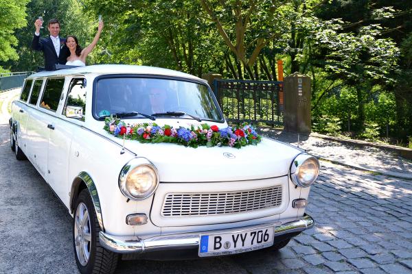 So wie Ihre Hochzeit einmalig und wunderschön werden wird, ist es auch dieser Hochzeitstrabi. Ein auffällige und einzigartige Mischung aus original, nostalgischem DDR Trabanten und einer modernen Luxuslimousine. Der Trabi im XXL Format wird Sie, Ihre ganze Hochzeitsgesellschaft und alle Passanten begeistern, wie kein zweites Fahrzeug. Genießen Sie Ihren Trag und stehen Sie mit diesem Stretchtrabi absolut im Mittelpunkt. Neben Hochzeiten und Jubelhochzeiten (Goldene Hochzeit, Silberhochzeit usw.) auch ideal für alle runden Geburtstage, Junggesellenabschiede (und Junggesellinnenabschiede), Jugendweihen und alle anderen, außergewöhnlichen Feste. Buchungen nach Absprache deutschlandweit möglich. NEU: In strahlendem "weiß" oder edlem "schwarz" erhältlich!
